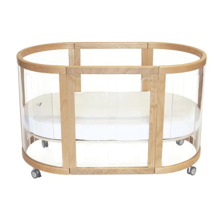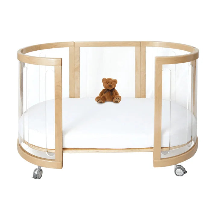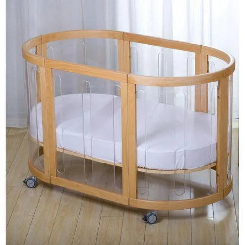 This crystal-clear crib lets you peek at your sleeping bundle of joy from every angle without making a sound. With its adjustable height and smooth-gliding lockable wheels, moving your tiny human from room to room is a total breeze. Crafted from sturdy and stylish perspex, it brings a modern, airy vibe to your nursery while keeping everything safe and breathable. It even pulls double duty as a cozy day bed, making it the coolest spot for nap time in the whole house.
