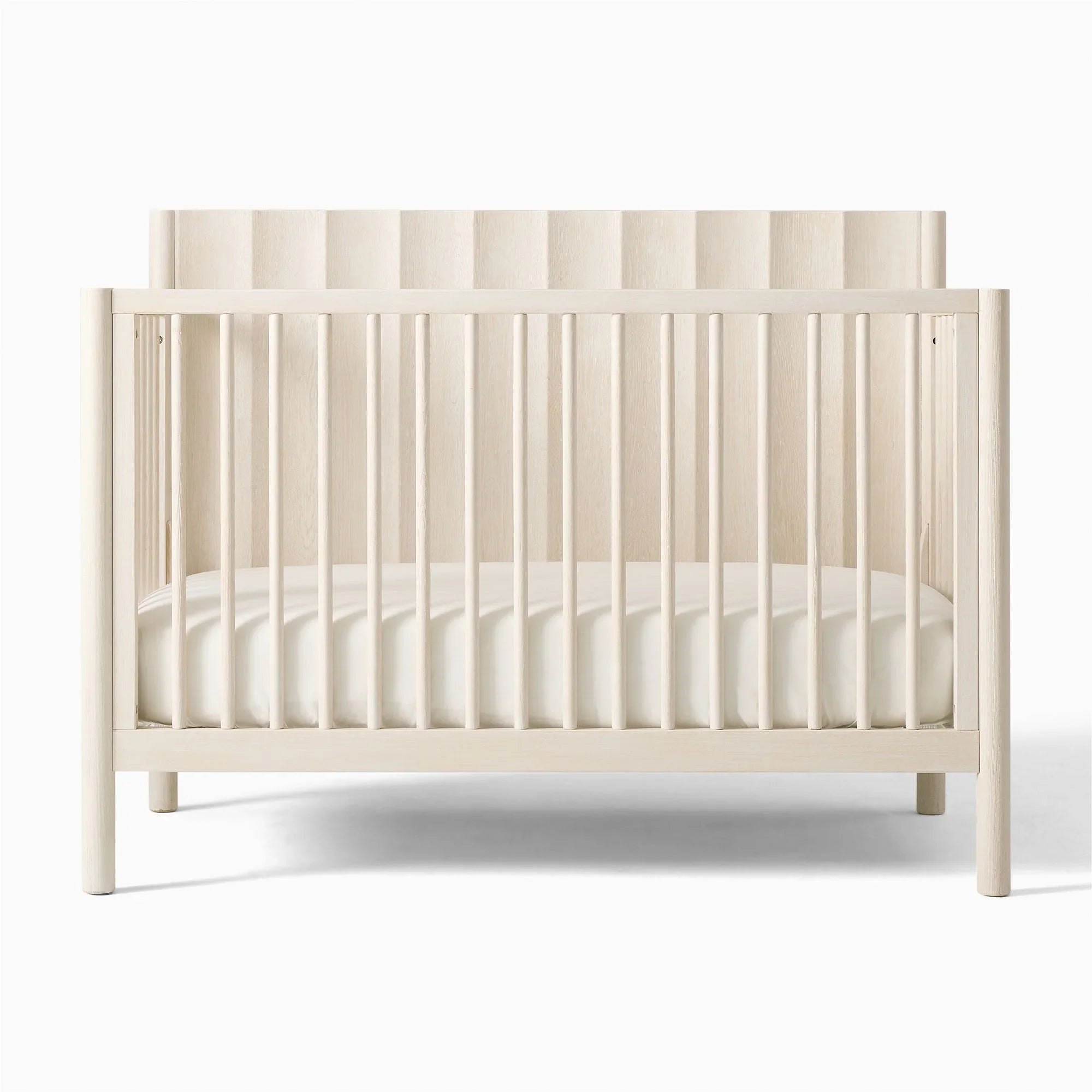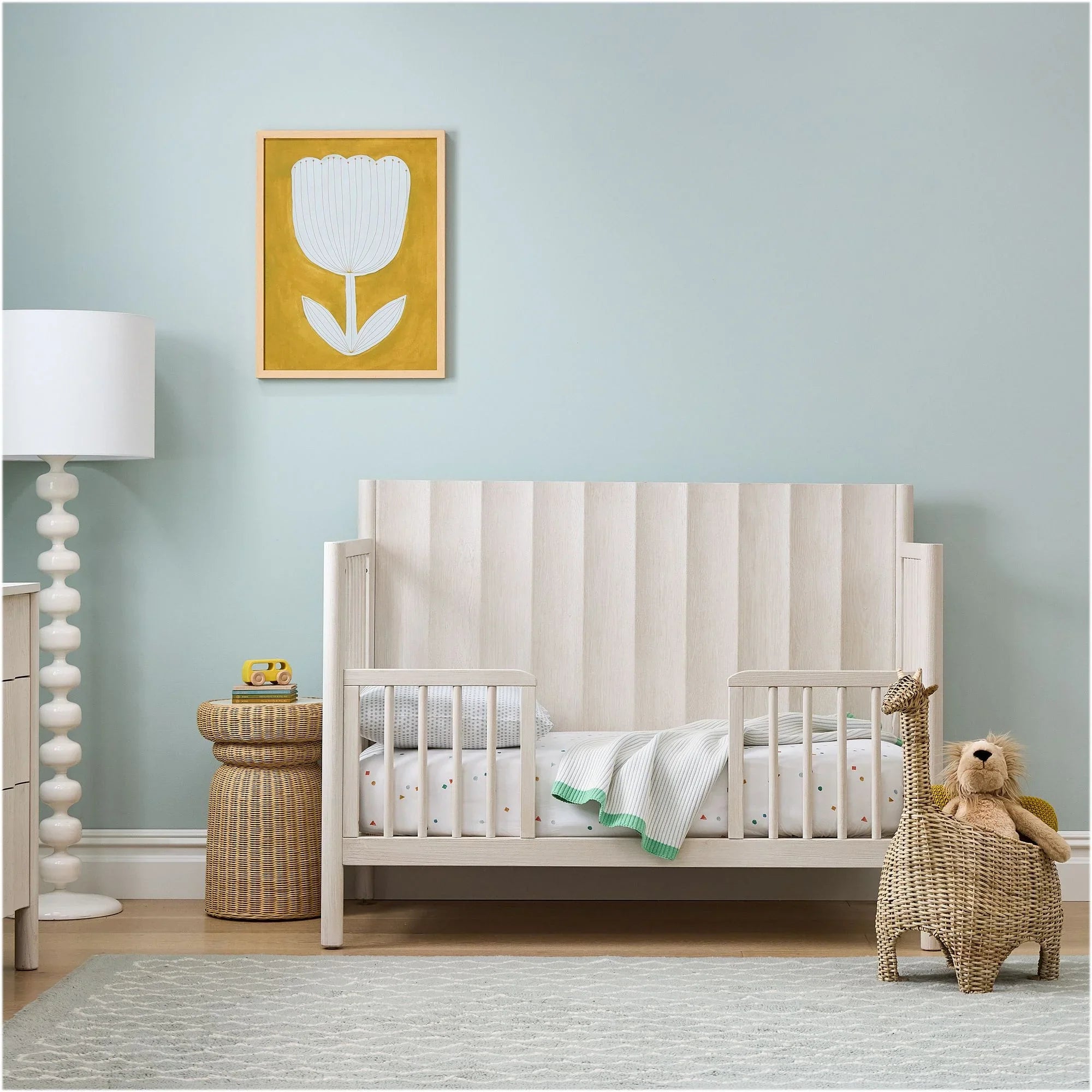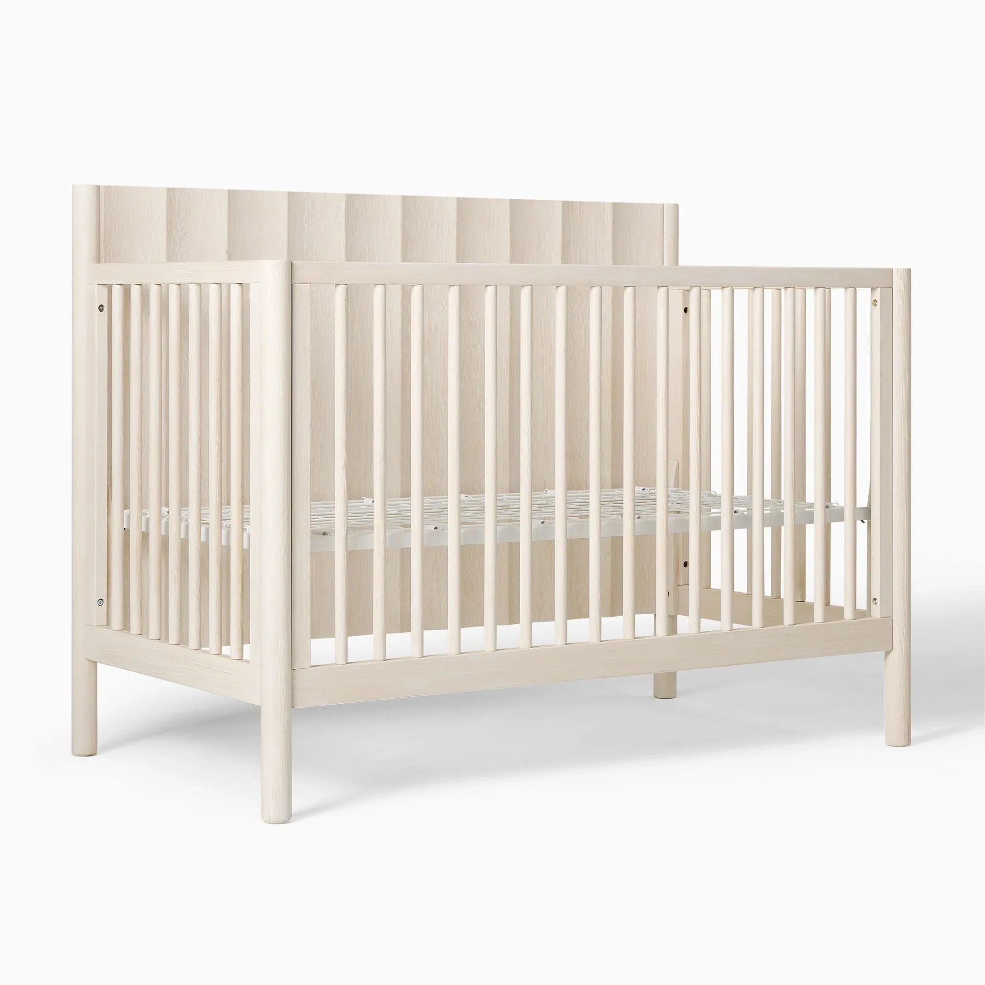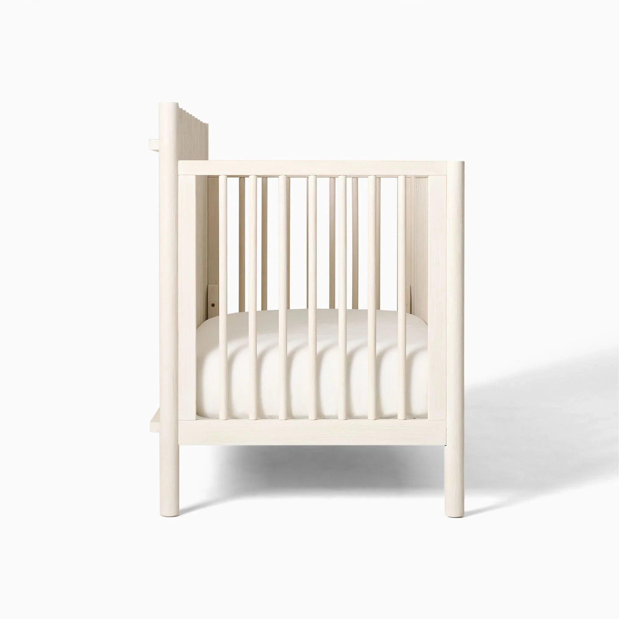 This sturdy solid wood frame creates a dreamy and safe sanctuary for your little explorer's nightly adventures. Vertical slats and smooth rounded edges ensure every nap time is as secure as it is stylish. The Scandinavian-inspired design brings a fresh, modern vibe to any nursery while standing up to years of use. Your tiny human will love snoozing in this durable and cozy wooden nest.