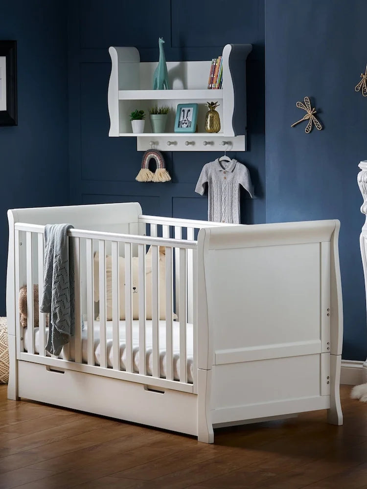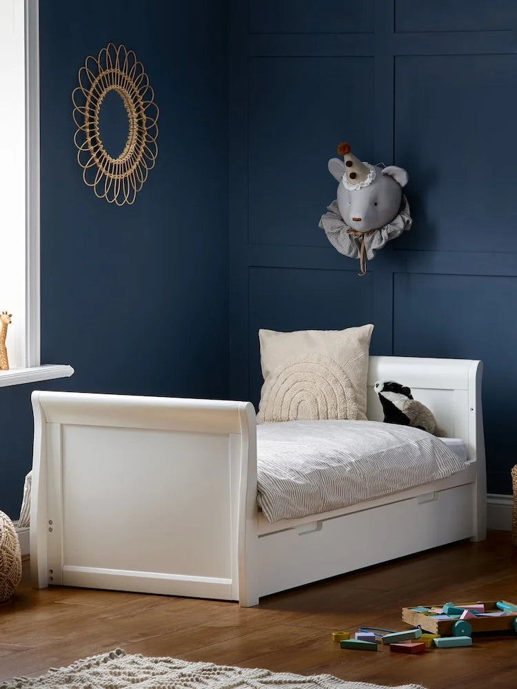 This solid wood sanctuary provides a dreamy and secure space for your little one to catch some serious Zs. With its sleek curved headboard and handy under-bed storage, keeping nursery essentials organized has never looked so chic. The adjustable height and smooth-rolling wheels mean this versatile cot moves wherever the nap-time action happens. Crafted from durable materials, it's designed to withstand every wiggle and giggle from infancy through the toddler years.
