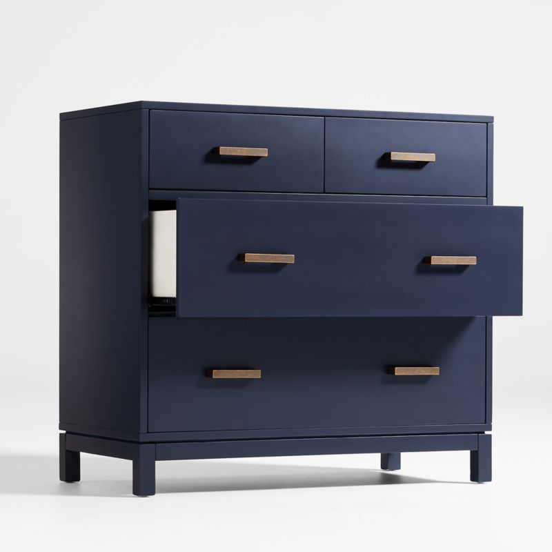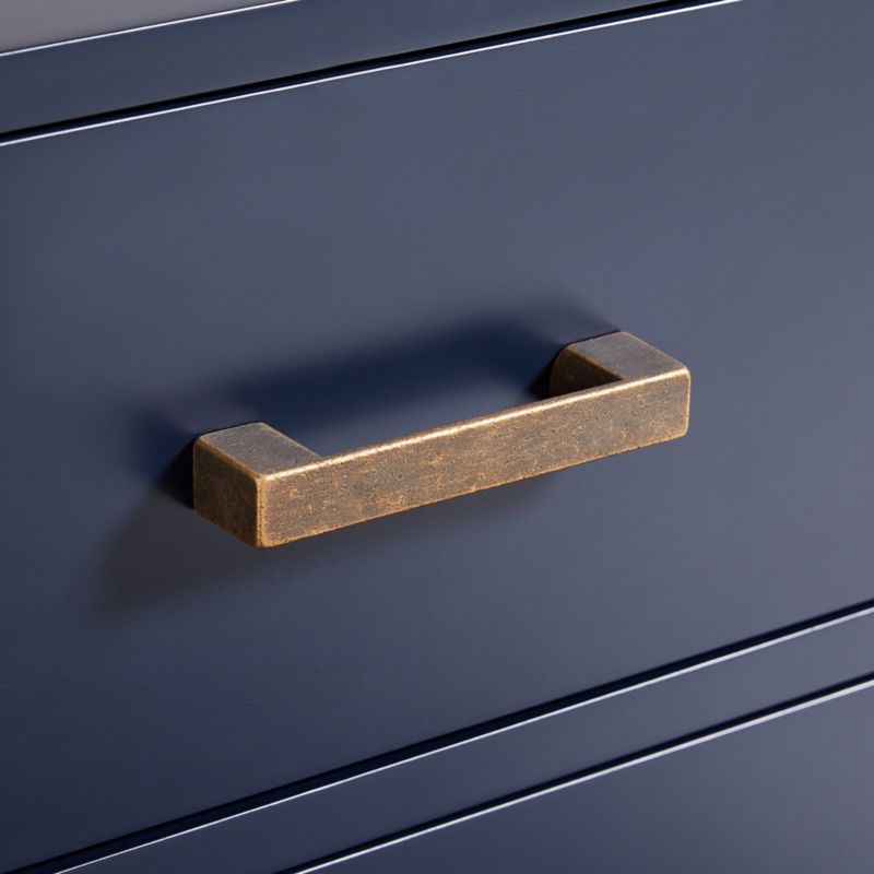 This playful 91cm Navy Blue Kids Dresser is a versatile storage sidekick for your little one's bedroom adventures, keeping clothes and secret treasures tucked away in style. Expertly crafted from solid poplar wood and low-emission engineered timber, this sturdy chest of drawers is built to withstand years of heavy-duty hide-and-seek and daily outfit changes. The sophisticated navy finish paired with large zinc pulls in an antique brass finish creates a timeless look that transitions effortlessly from a whimsical nursery to a cool teen hangout. With its compact footprint and generous storage capacity, this dresser ensures that even the smallest rooms stay organized and clutter-free while providing a stylish and dependable bedroom essential.