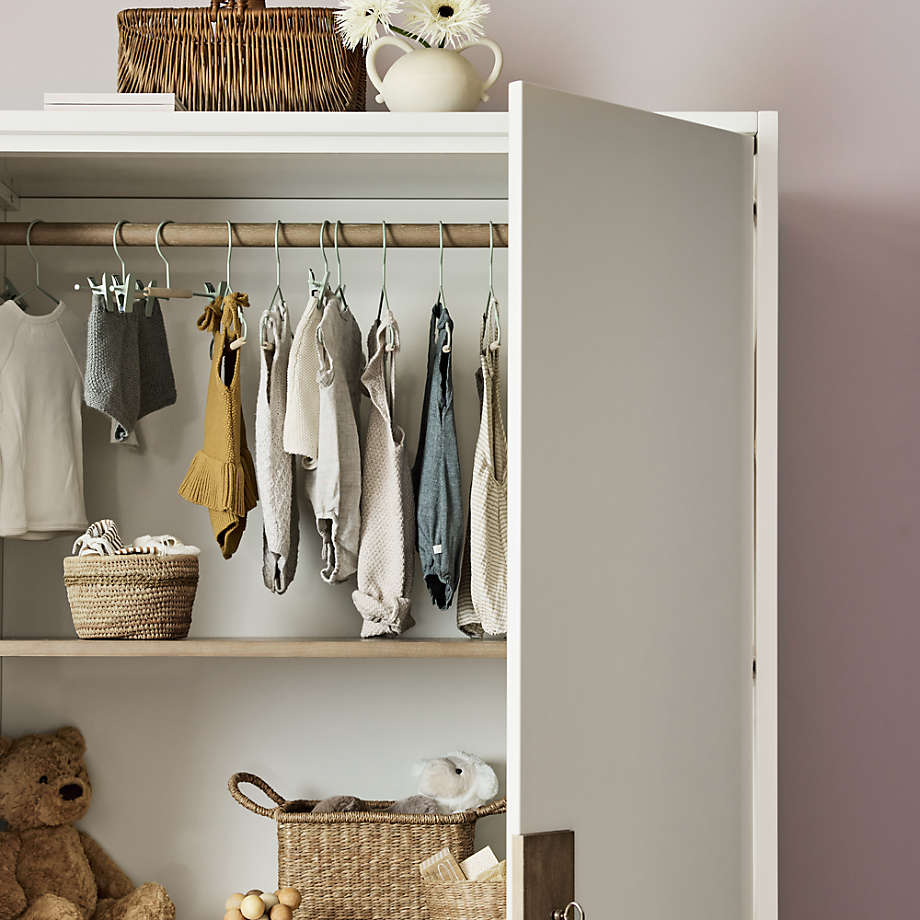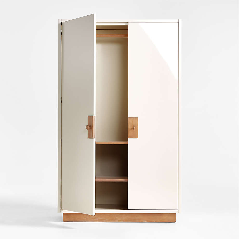 This stunning ivory high-gloss lacquer storage armoire cabinet brings a dash of whimsical charm to your little one's room with its unique mismatched knob and key. Featuring beautiful hazelnut wood accents and a wipe-clean finish, this versatile piece handles everything from fluffy stuffed animals to tiny designer outfits with ease because it is built for the messy reality of growing up. The interior boasts adjustable shelves and a removable hanging bar, allowing this sophisticated storage solution to evolve alongside your child's needs while maintaining its high-design aesthetic. Enhance your nursery or bedroom organization with this chic, durable furniture piece that blends playful sophistication with practical functionality to create a tidy and stylish sanctuary.